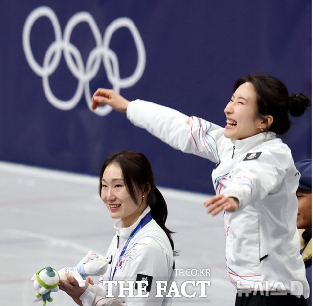 한국 여자 쇼트트랙의 '간판' 김길리(오른쪽)와 최민정이 21일(한국 시간) 이탈리아 밀라노 아이스스케이팅 아레나에서 열린 2026 밀라노·코르티나 동계올림픽 쇼트트랙 여자 1500m 시상식에서 기뻐하고 있다./밀라노=뉴시스 |