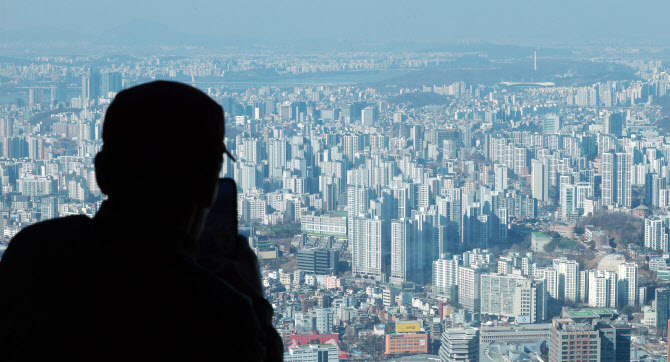 19일 서울 남산 N서울타워에서 시민이 집합건물 중심 지역을 바라보고 있다. |