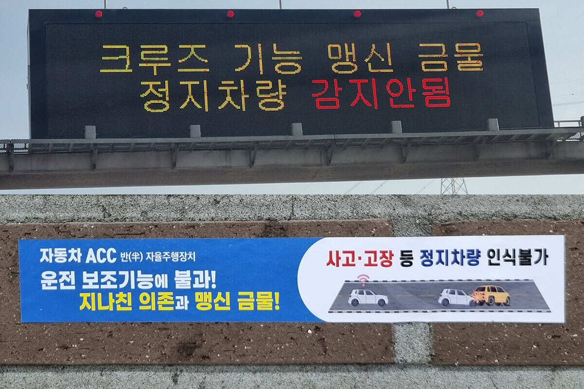 고속도로 전광판에 표출되는 크루즈 기능 주의 문구(위쪽)와 고속도로 휴게소에 설치된 크루즈 기능 주의 홍보물 |