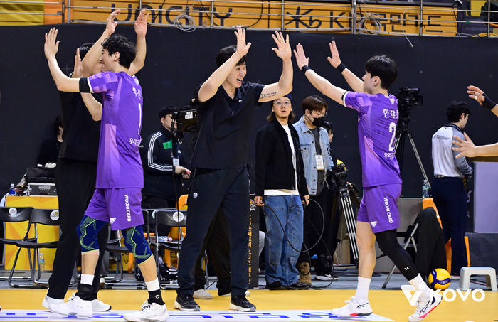 박철우 감독 대행이 이끄는 우리카드는 21일 경기도 의정부 경민대학교 기념관에서 열린 KB손해보험과 진에어 2025~2026 V리그 남자부 맞대결에서 세트 스코어 3-2로 승리했다. 승점 2를 추가한 우리카드(승점 43)는 4연승을 질주, 3위 KB손해보험(승점 47)과 격차를 4점으로 줄였다.