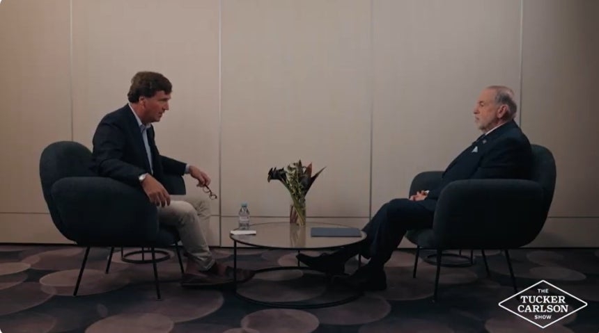 보수 논객 터커 칼슨(왼쪽)과 인터뷰 중인 마이크 허커비 주이스라엘 미국대사. [터커 칼슨 유튜브] |
