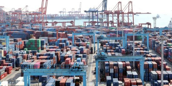 지난달 28일 부산항 신감만부두, 감만부두에 컨테이너가 쌓여 있는 모습. 연합뉴스 |