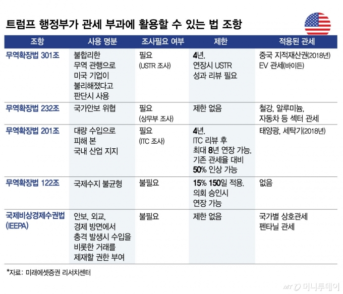 트럼프 행정부가 관세 부과에 활용할 수 있는 법 조항/그래픽=김현정 |