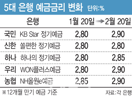 22일 금융권에 따르면 주요 은행들은 지난주부터 각 은행 대표상품 예금 금리를 높이고 있다. 우리은행은 이날 WON플러스예금 12개월 만기 금리를 2.90%로 0.05%포인트 인상했다. 지난 10일 같은 상품 금리를 2.80%에서 2.85%로 인상한 지 5영업일 만이다. 5대 은행 중에서는 하나은행이 가장 앞서 금리를 올리며 수신금리 인상 경쟁을 시작했다. 하나은행은 이달 9일 정기예금 금리를 2.80%에서 2.85%로 인상했다. 지난 1월 8일 2.85%에서 2.80%로 금리를 내린 지 한 달 만의 상향조정이다. NH농협은행은 이틀 뒤인 11일 NH올원e예금의 1년 만기 이자를 연 2.85%에서 2.90%로 인상했다. 뒤이어 KB국민은행은 어제(19일)부터 KB Star 정기예금 금리를 2.80%에서 2.90%로 0.10%포인트 올렸다. 이에 따라 5대 은행의 대표 예금상품 평균 금리는 1월 20일 2.81%(단순 평균)에서 이달 20일 2.87%로 한 달 만에 0.06%포인트 올랐다.