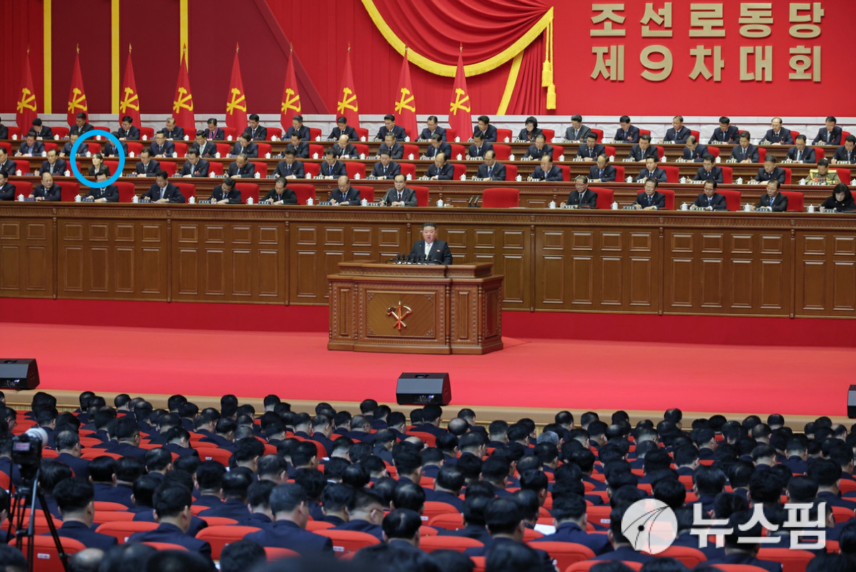 [서울=뉴스핌] 이영종 통일북한전문기자 = 북한 노동당 총비서 겸 국무위원장인 김정은이 21일 평양 4.35문회화관에서 열린 노동당 제9차 대회에서 사업총화 보고를 하고 있다. 뒤편으로 여동생인 김여정(파란 원) 노동당 부부장이 보인다. [사진=북한매체 종합] 2026.02.22 yjlee@newspim.com |