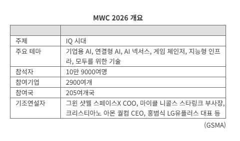 [파이낸셜뉴스] 세계 최대 이동통신 전시회인 '모바일월드콩그레스(MWC) 2026'가 다음 달 3일(현지시간) 스페인 바르셀로나에서 나흘 일정으로 막을 올린다. 올해 MWC 주제는 'IQ 시대(The IQ Era)'다. 인간의 통찰력과 더 고도화된 AI를 접목한 새로운 네트워크와 제품들을 통해 실질적 성과를 내는 미래가 중점적으로 제시될 전망이다. 전 세계 205여개국, 2900여개 기업이 참여해 AI 기술 우위를 증명하기 위한 각축전이 벌어질 것으로 전망된다.