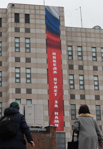 주한러대사관, '승리는 우리의 것' 현수막 게시 (서울=연합뉴스) 서명곤 기자 = 22일 서울 중구 주한 러시아대사관 건물 외벽에 '승리는 우리의 것이다'라고 적힌 현수막이 걸려있다. 주한러시아대사관은 이 현수막을 내건 뒤, 우리 정부의 우려 전달에도 이를 철거하지 않고 있는 것으로 알려졌다. seephoto@yna.co.kr (끝) <저작권자(c) 연합뉴스, 무단 전재-재배포, AI 학습 및 활용 금지> |