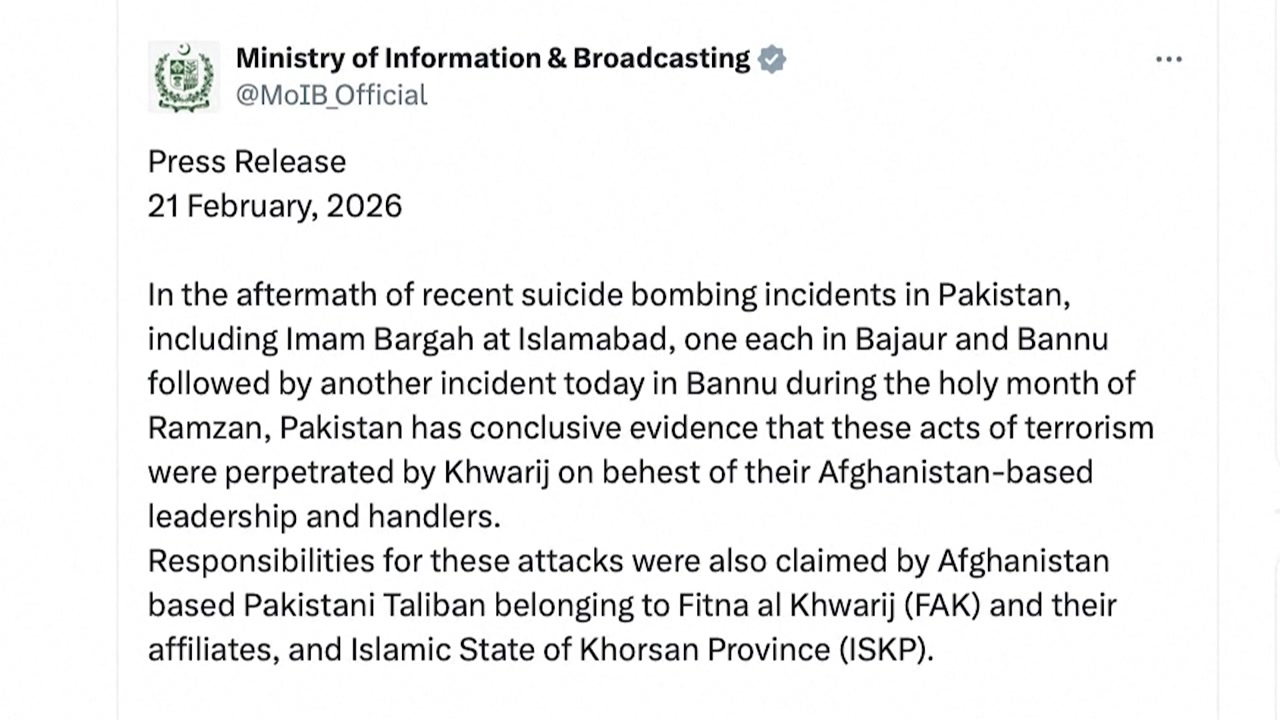 파키스탄 측은 최근 벌어진 폭탄 테러 공격들이 "아프간에 기반을 둔 무장세력에 의해 자행됐다는 증거"를 확보했다고 밝혔습니다.