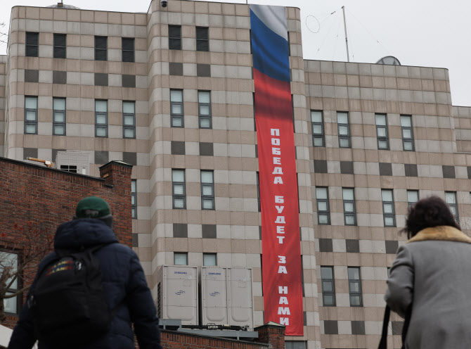 22일 외교부 등에 따르면 주한러시아대사관은 최근 서울시 중구에 위치한 대사관 건물 외벽에 러시아어로 ‘승리는 우리의 것’이라고 적힌 대형 현수막을 게시했다.