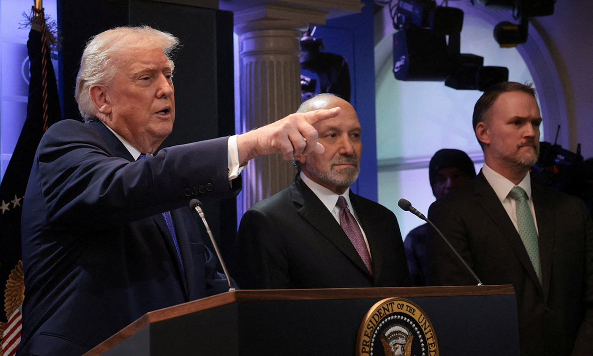 분노한 트럼프 도널드 트럼프 미국 대통령(왼쪽)이 20일(현지시간) 워싱턴 백악관에서 상호관세 조치는 대통령 권한을 넘어선 위법이라는 미국 연방대법원 판결과 관련해 기자회견을 열고 있다. 하워드 러트닉 미 상무장관(가운데)과 제이미슨 그리어 미 무역대표부 대표도 배석했다. 워싱턴=로이터연합뉴스 |