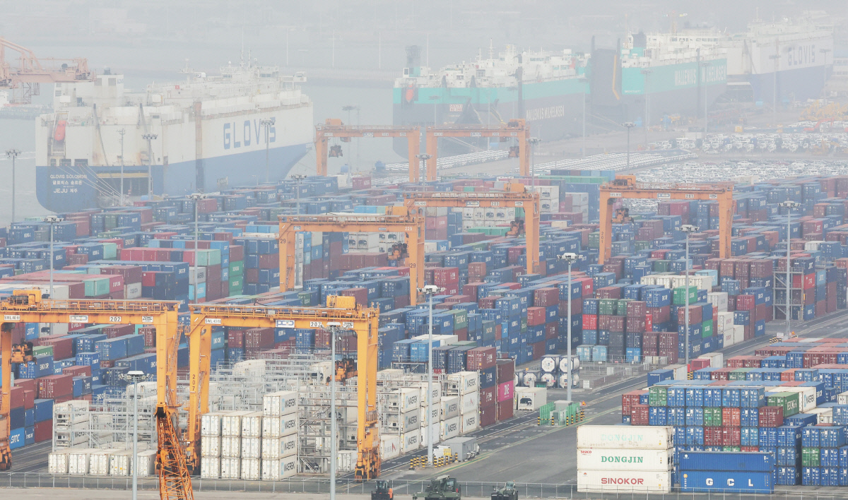뿌연 평택항 22일 경기 평택항에 컨테이너가 쌓여 있다. 도널드 트럼프 미국 대통령은 21일(현지시간) 미 연방대법원의 상호관세 위법 판결 이후 전 세계에 새롭게 부과하겠다고 한 글로벌 관세를 10%에서 15%로 인상하겠다고 밝혔다. 연합뉴스 |