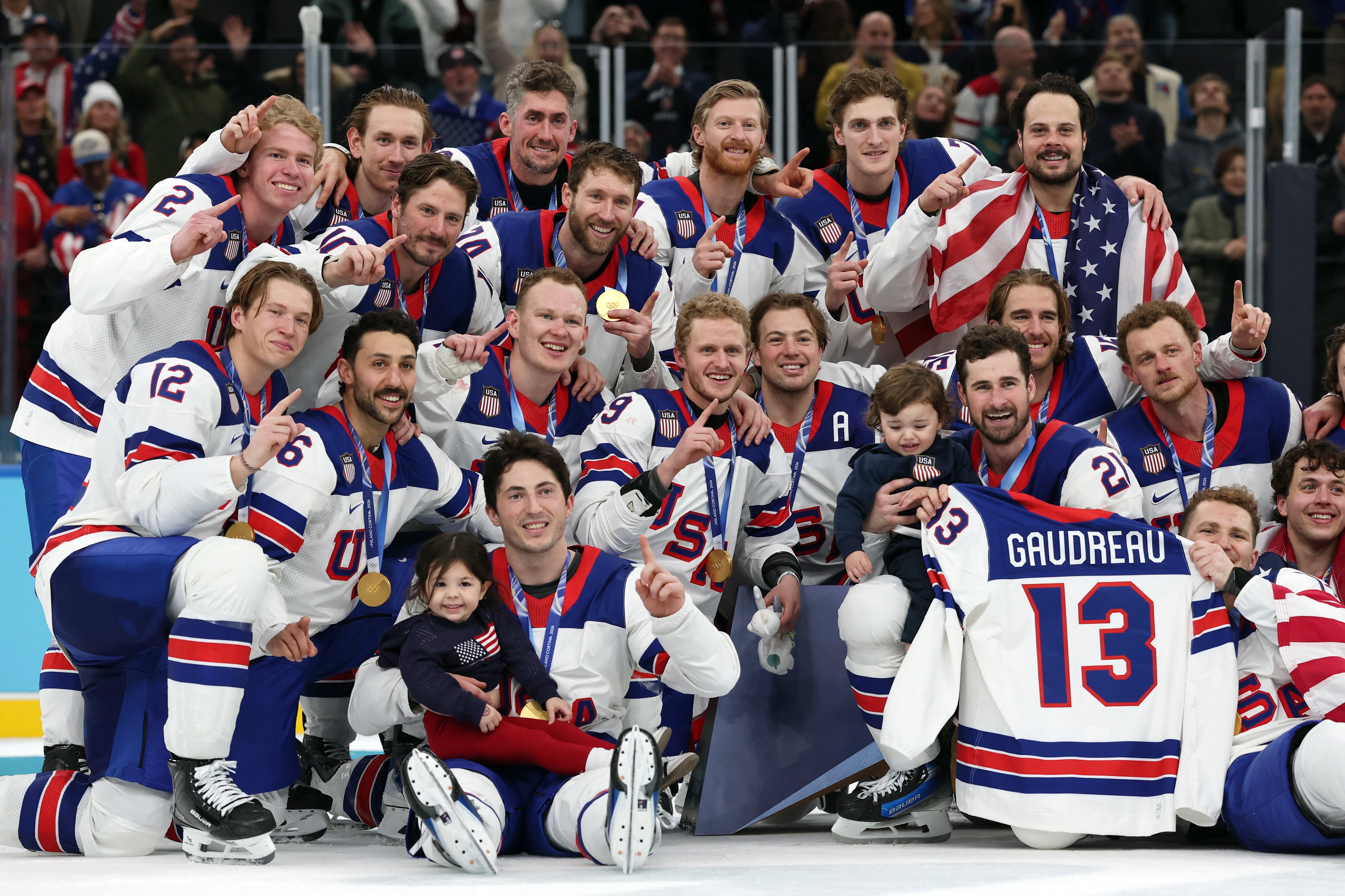 22일 밀라노 코르티나 동계올림픽 아이스하키 결승에서 캐나다를 꺾은 미국 대표팀이 기뻐하고 있다./밀라노=김동현 기자 |