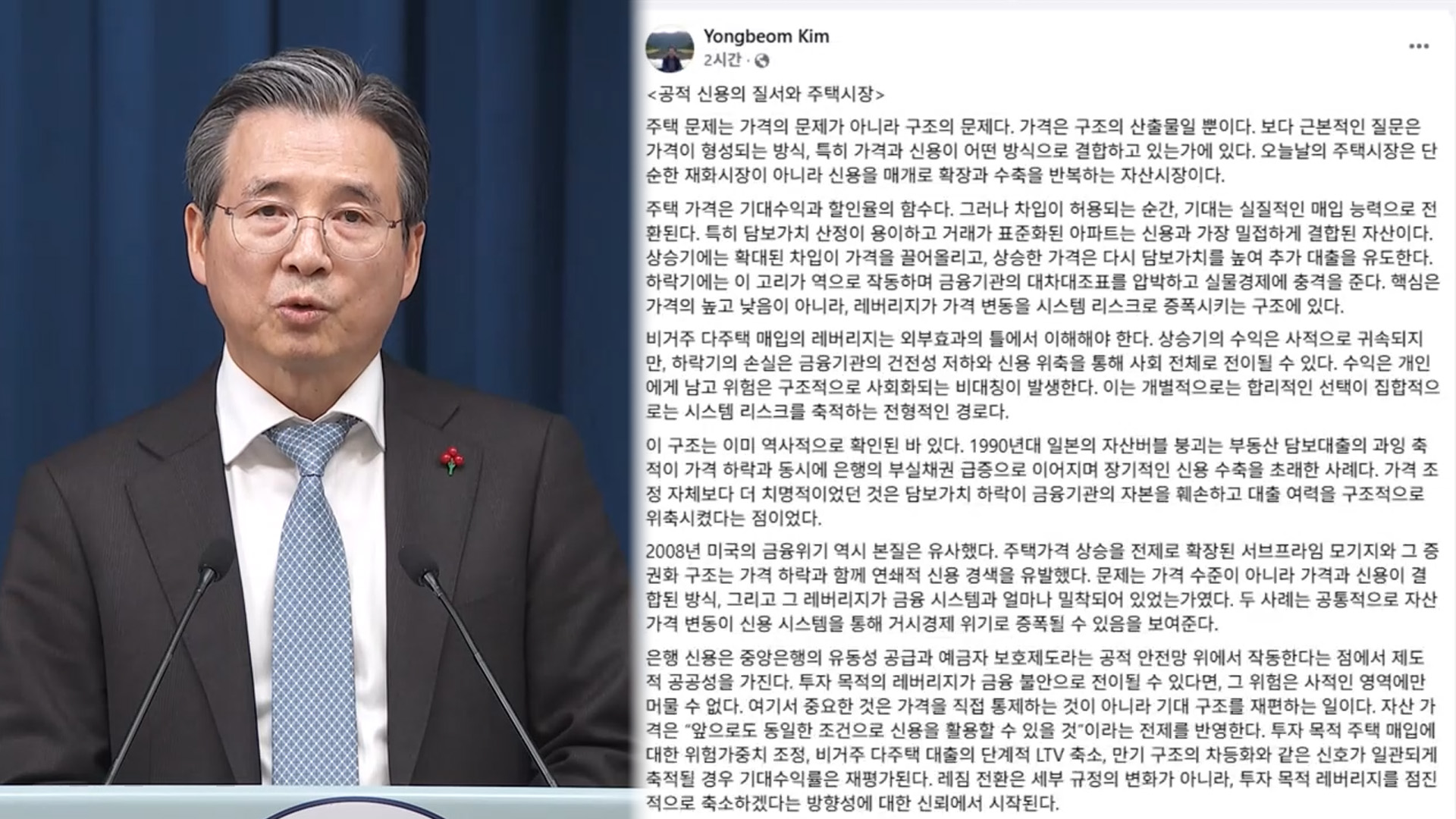 김용범 청와대 정책실장은 주택시장에서 투자 목적으로 사용되는 담보대출이나 갭투자 전세금 등의 '레버리지'가 거시경제의 위기로 연결될 가능성을 지적했습니다.