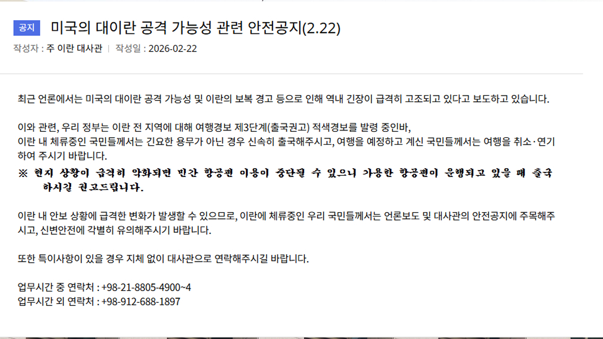 주이란대한민국대사관이 미국의 대이란 공격에 대비해 우리 국민의 신속 출국을 당부했습니다.
