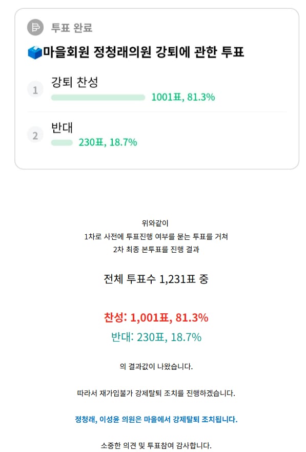 네이버 카페 ‘재명이네 마을’ 운영진은 22일 정 대표와 이 최고위원의 강제 탈퇴에 관한 투표 결과를 공지했다. 이에 따르면 전체 투표 수 1231표 중 찬성 1001표(81.3%), 반대 230표(18.7%)로 나타났다.