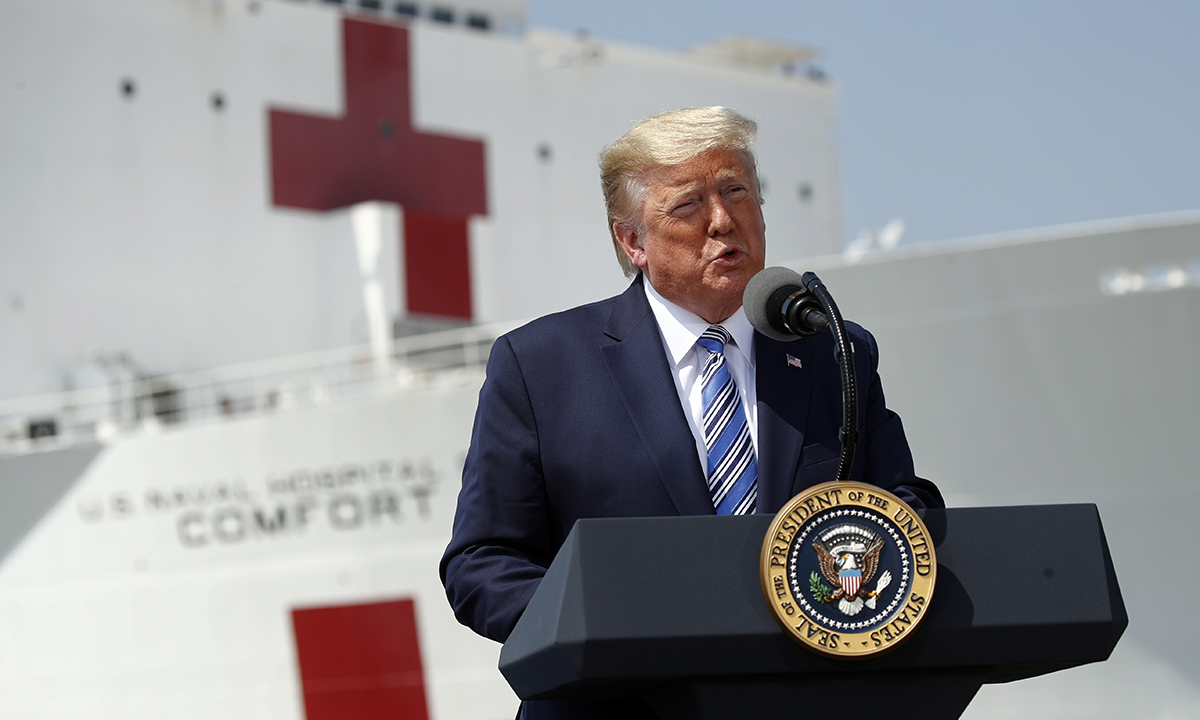 도널드 트럼프 미국 대통령이 덴마크령 그린란드에 미 해군 소속의 대형 병원선을 보내겠다고 밝혀 눈길을 끈다. 사진은 코로나19 팬데믹이 한창이던 2020년 3월 당시 대통령이던 트럼프가 코로나19 확진자 격리 치료를 위해 뉴욕으로의 출항을 앞둔 병원선 ‘컴포트’ 앞에서 연설하는 모습. 세계일보 자료사진 |