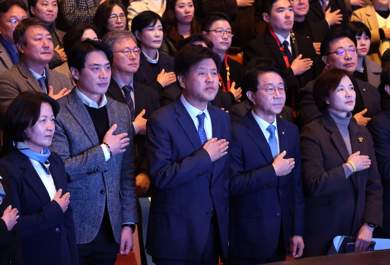 지난 20일 김용(앞줄 가운데) 전 민주연구원 부원장이 경기아트센터에서 ‘대통령의 쓸모’ 출판기념 토크 콘서트를 연 가운데 추미애(앞줄 왼쪽부터) 의원과 한준호 의원 등 내빈들이 국기에 대해 경례하고 있다. [연합] |