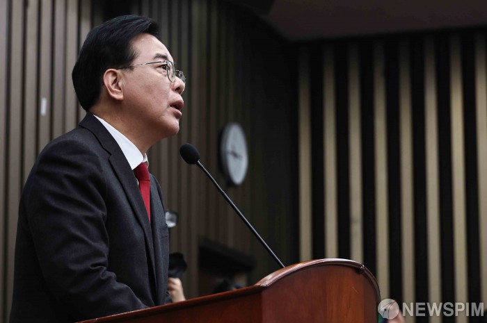 [서울=뉴스핌] 윤창빈 기자 = 송언석 국민의힘 원내대표가 23일 오전 서울 여의도 국회에서 열린 의원총회에서 모두발언을 하고 있다. 2026.02.23 pangbin@newspim.com
