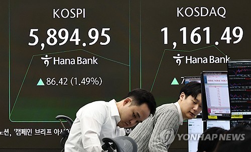 (서울=연합뉴스) 고은지 기자 = 코스피가 23일 개장하자마자 사상 처음 5,900선을 돌파한 후 오름폭을 조절 중이다.
