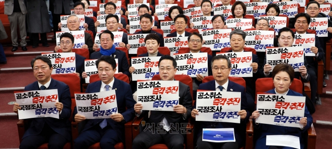 이재명 대통령 사건 공소 취소와 국정조사 추진을 위한 의원 모임에 참여한 더불어민주당 의원들이 23일 서울 여의도 국회 의원회관에서 열린 출범식 및 결의대회에서 손팻말을 들고 있다. 2026.2.23 안 주영 전문기자 |