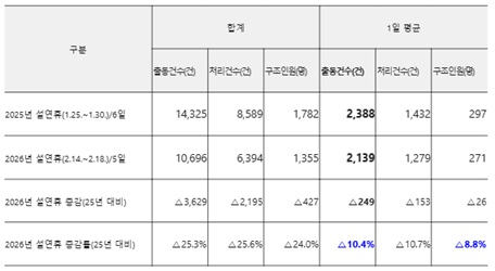 지난해 연휴(6일간)와 비교하면 올해 평균 구조 출동은 249건(10.4%) 감소했고, 구조 인원 또한 26명(8.8%) 줄어 전반적인 구조 수요는 감소한 것으로 나타났다.