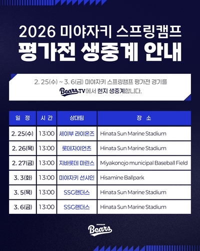 두산은 일본 미야자키현에서 열리는 구춘 대회 3경기(25일 세이부 라이온즈, 26일 롯데 자이언츠, 27일 일본 지바 롯데 머린스)와 연습경기 3경기(3월 3일 미야자키 선샤인, 5∼6일 SSG 랜더스)를 구단 공식 유튜브 채널 'BEARS TV'를 통해 송출한다.