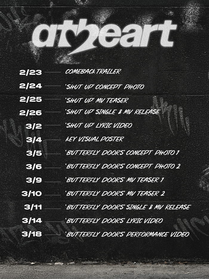 앳하트는 지난 22일 공식 SNS를 통해 컴백 스케줄러를 게재했다. 이에 따르면, 앳하트는 오는 2월 26일 오후 6시 디지털 싱글 ‘Shut Up’을, 3월 11일 오후 6시 또 다른 디지털 싱글 ‘Butterfly Doors’를 잇달아 발매하며 컴백 열기를 이어간다.