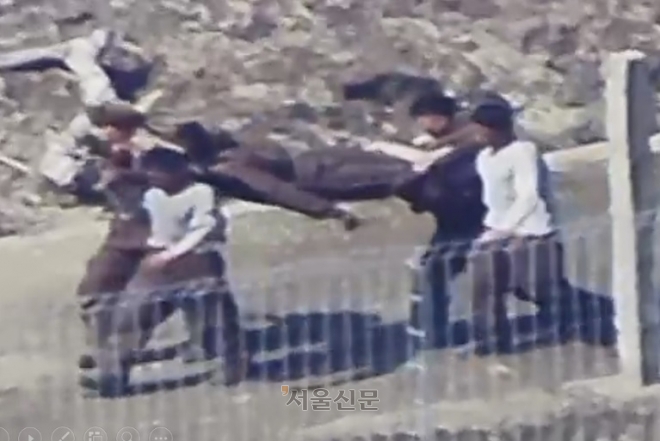 합동참모본부는 최근 북한군 활동자료를 27일 공개했다. 사진은 북한군이 동부전선에서 지뢰폭발 사상자를 들것에 후송하는 모습 및 지뢰폭발 추정 연기. 2025.3.27 합참 제공 |