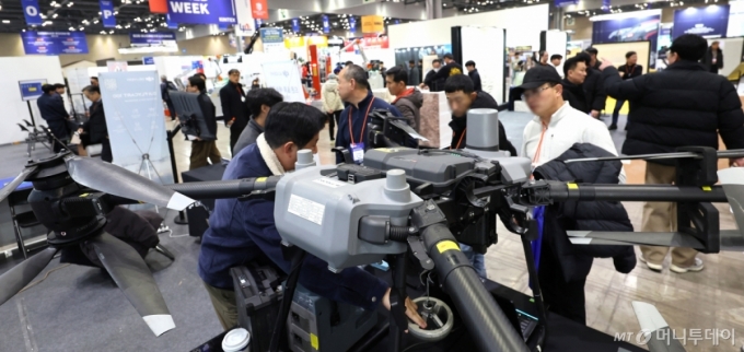 우주항공청은 드론쇼코리아가 2026년 2월 25일부터 27일까지 부산 벡스코에서 열린다고 밝혔다. 사진은 지난달 경기도 고양시 킨텍스에서 열린 2026 코리아빌드위크에 전시된 물류 및 배송 드론/ 사진=뉴시스 |