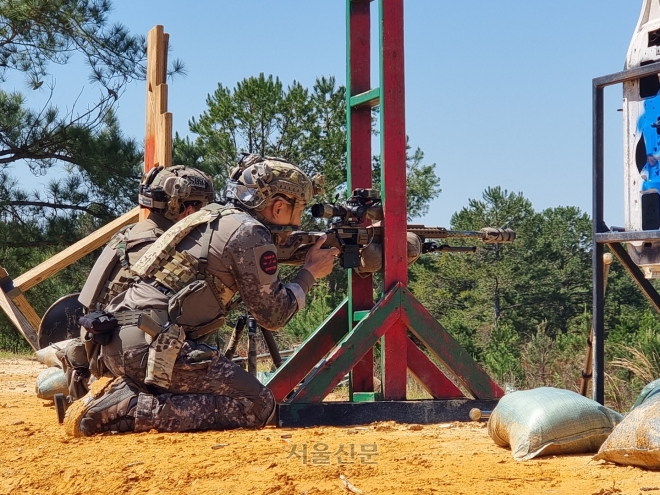 1군단 특공연대 저격수팀 장제욱 중사(사수)와 박대운 상사(관측수)가 타켓을 저격하고 있는 모습이다. 2025.4.23 육군 제공 |