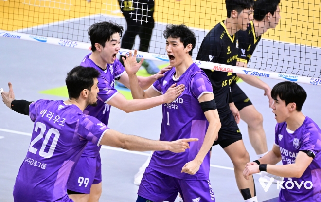 우리카드 선수들이 21일 의정부 경민대 기념관에서 열린 남자부 5라운드 KB손해보험과 경기에서 공격을 성공시킨 뒤 환호하고 있다. 한구배구연맹 제공 |