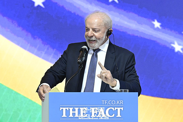 [더팩트 | 송호영 기자] 국빈 방한 중인 루이스 이나시우 룰라 다시우바 브라질 대통령이 23일 오후 서울 중구 롯데호텔서울 크리스탈볼룸에서 열린 '한-브라질 비지니스 포럼'에 참석해 발언하고 있다.