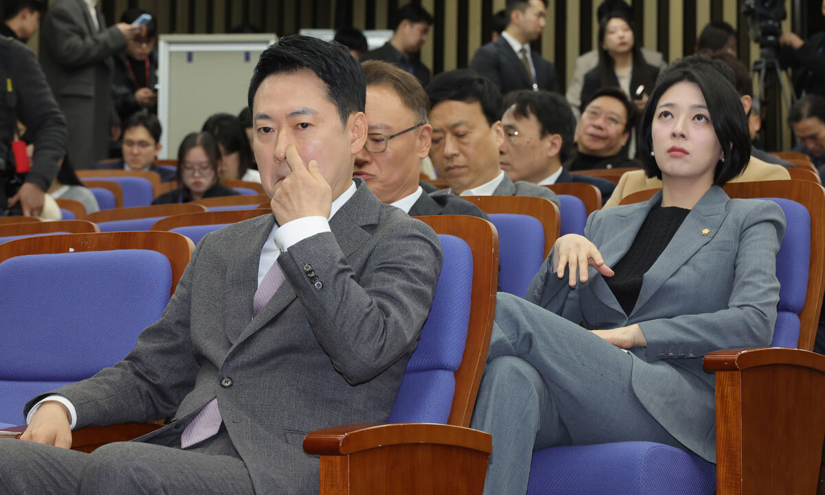 싸늘 국민의힘 장동혁 대표가 법원의 내란 유죄 선고에도 ‘절윤’을 거부해 당내 내홍이 심화하는 가운데 23일 국회에서 열린 의원총회에 장동혁 대표(왼쪽)와 배현진 의원 등이 참석해 있다. 이날 의총에서 장 대표의 절윤 거부 등 현안보다 당명 개정 등에 대한 보고만 길게 이뤄지자 배 의원은 “이런 한가한 얘기만 할 일인가”라고 비판했다. 이재문 기자 |