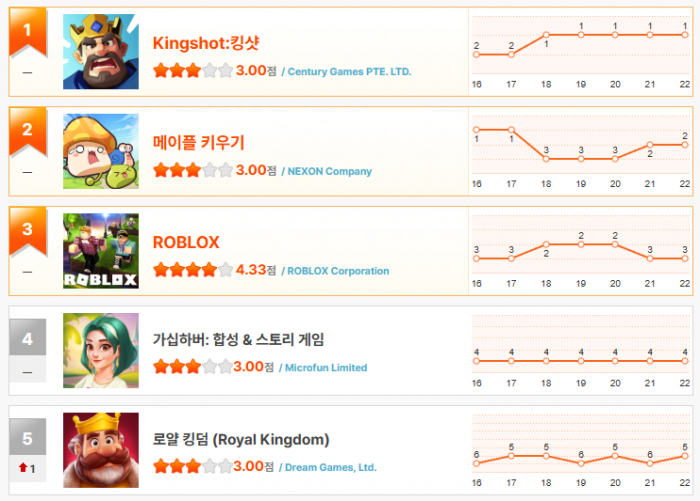 메이플 키우기는 최종적으로 2위에 안착했다. 환불 이슈와 맞물리며 이전과 같은 압도적 흐름은 아니지만, 여전히 상위권을 단단히 지키며 장기 흥행 저력을 보여주고 있다. 그 뒤를 이어 ‘로블록스’가 3위를 유지하며, 설 연휴 효과와 유저층 확장을 다시 한 번 입증했다. ‘가십하버: 합성 & 스토리 게임’은 큰 변동 없이 4위를 지켰고, ‘로얄 킹덤’은 한 계단 상승하며 5위에 올라 상위권 재진입 흐름을 이어갔다.