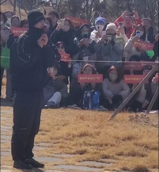 입영지 인근에는 이른 아침부터 팬들의 발걸음이 이어졌다. 전국 각지에서 모인 팬들 약 900여 명 규모로 집결해 현장을 메웠고, 해병대 1327기 입대생 전체를 응원하는 해병대 상징색 빨간 풍선과 응원 문구가 적힌 현수막이 길게 이어지며 배웅 분위기가 형성됐다.
