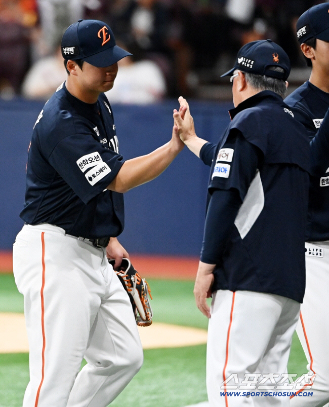 4일 고척스카이돔에서 열린 한화와 키움의 경기, 한화가 2대1로 승리했다. 김경문 감독과 노시환이 기쁨을 나누고 있다. 고척=허상욱 기자wook@sportschosun.com/2025.07.04/ |