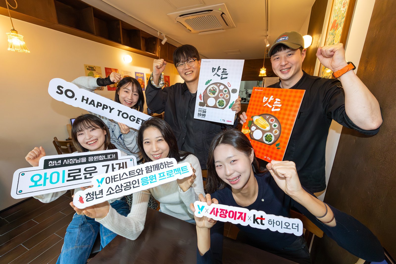 KT는 20대 전용 브랜드 ‘Y’와 소상공인 사업성장 플랫폼 ‘사장이지(하이오더)’가 공동으로 청년 소상공인 상생 프로젝트 ‘와이로운 가게’를 운영한다고 23일 밝혔다. 청년 소상공인에게 브랜딩과 마케팅을 지원하는 프로그램으로, 사진은 서울 성동구 성수동에 있는 한식 매장 ‘맛든’에서 청년 소상공인과 Y아티스트가 ‘와이로운 가게’를 홍보하는 모습.