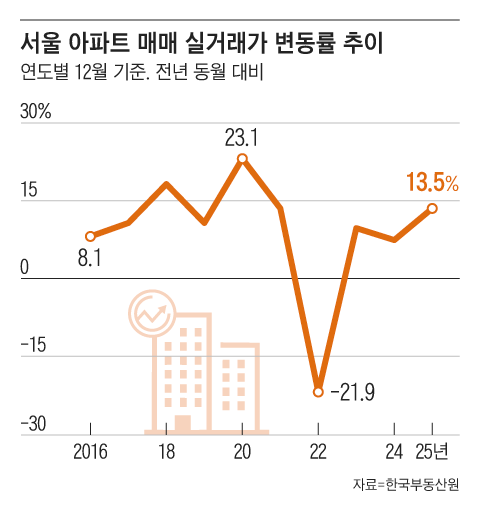 서울시는 한국부동산원 자료를 분석한 결과, 작년 12월 서울 아파트 매매 실거래 가격이 1년 전인 2024년 12월과 비교해 13.5% 올랐다고 23일 밝혔다. 서울시의 분석은 부동산원이 매달 발표하는 실거래가 지수에 기반한 것으로, 표본 주택의 시세를 조사하는 다른 통계와 달리, 실제 거래가 이뤄진 아파트의 매매 가격만 집계한 것이다. 시장 상황을 빠르게 반영하지만, 거래량이 너무 적을 때에는 신뢰도가 떨어질 수 있다는 한계점도 있다.