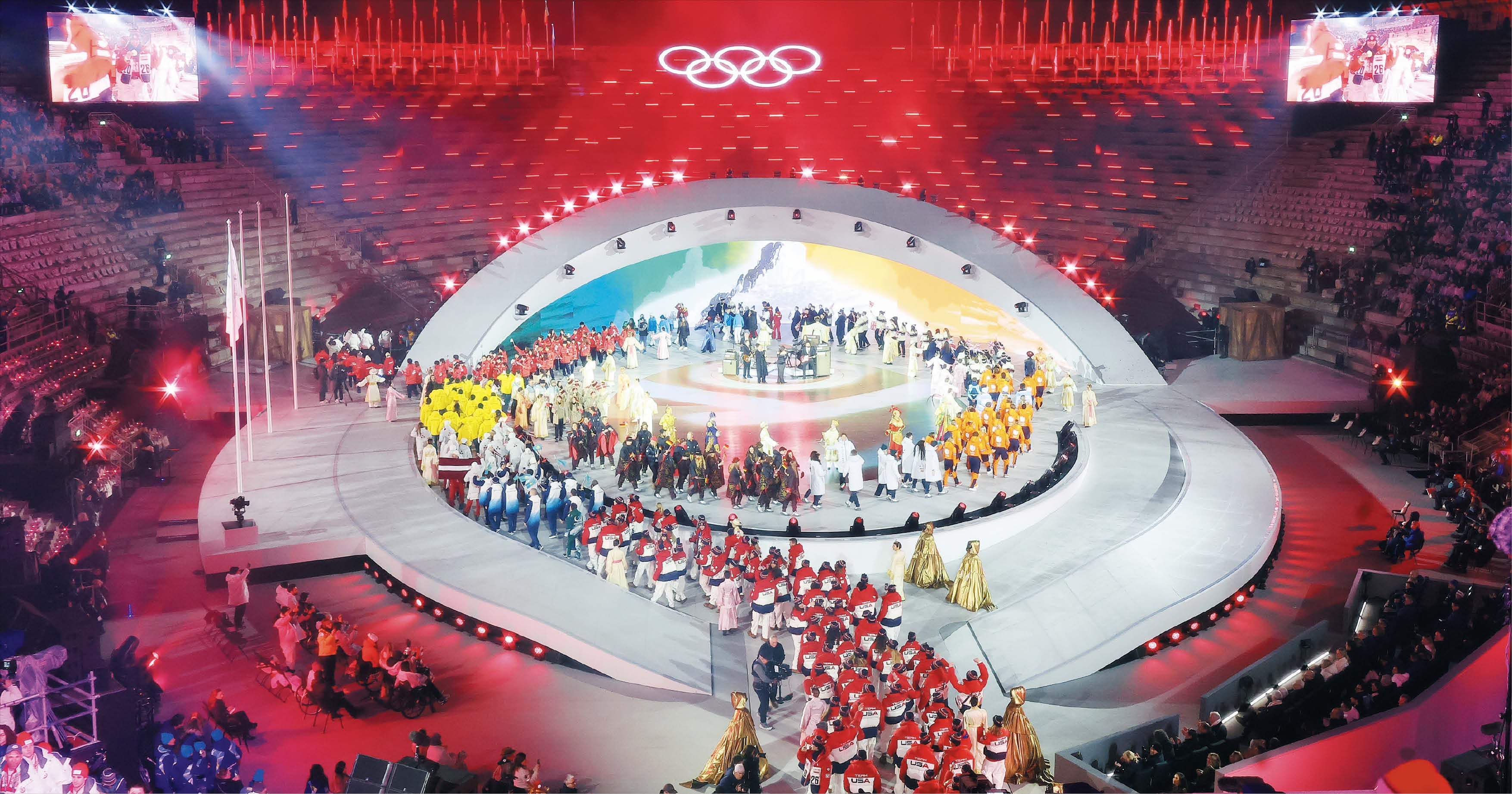 22일(현지 시각) 이탈리아 베로나 아레나에서 열린 2026 밀라노 코르티나 동계 올림픽 폐회식에서 각국 선수단이 입장하고 있다. 2000년 넘는 역사의 야외 공연장에서 열린 이날 행사는 ‘뷰티 인 액션’(역동하는 아름다움)이란 주제로, 거대한 음악회처럼 진행됐다. 한국 선수단은 쇼트트랙 대표 최민정과 황대헌이 기수를 맡아 행진했고, IOC 선수위원에 당선된 원윤종도 단상에 올라 관중에게 인사를 전했다. 대회 조직위는 올림픽기를 차기 개최지인 프랑스 알프스에 전달했다.