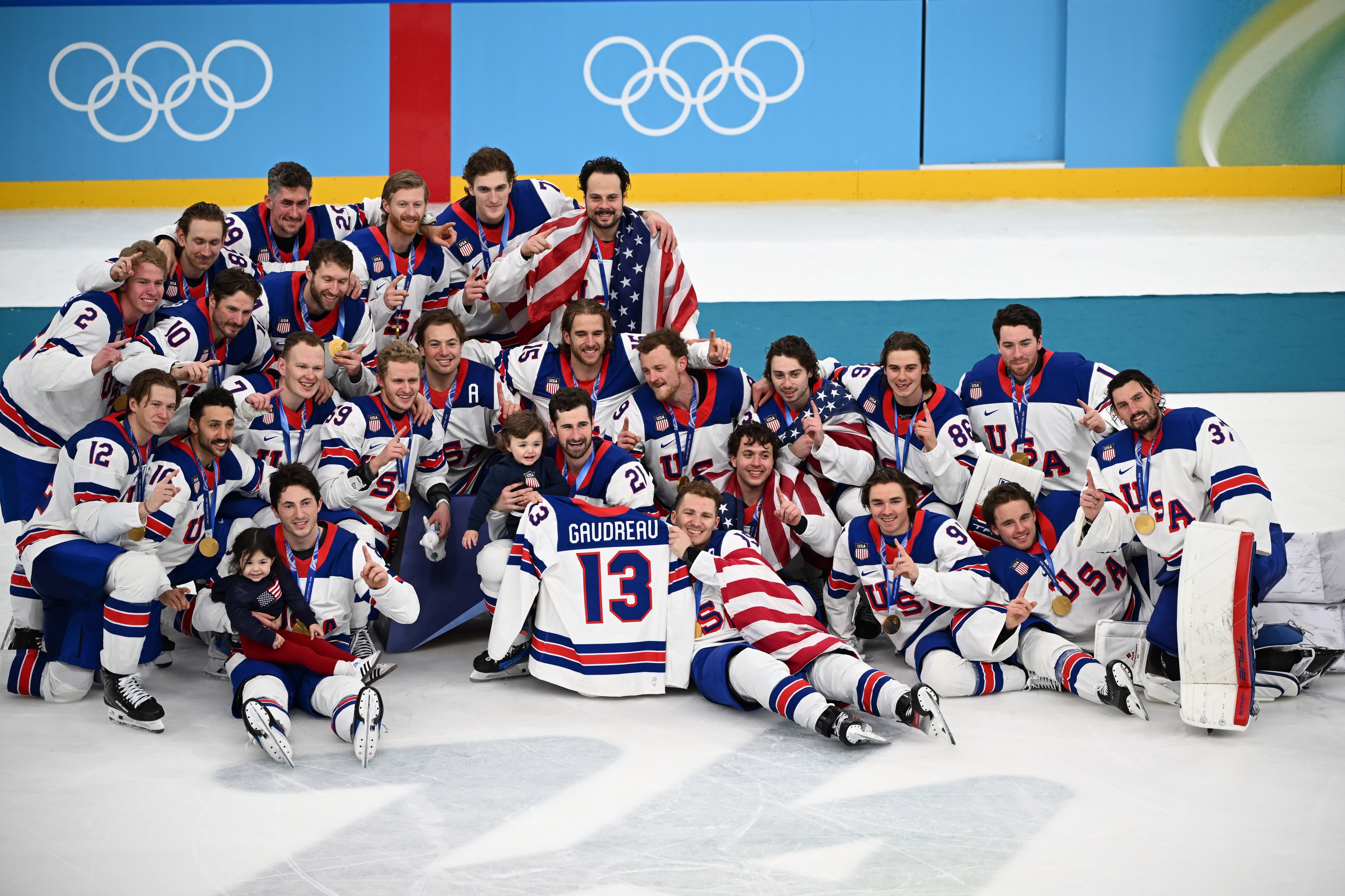 22일 남자 아이스하키 우승을 차지한 미국 대표팀이 시상식에서 기념사진을 찍고 있다. 앞줄의 어린이는 2024년 교통사고로 세상을 떠난 미국 국가대표 조니 고드로의 아들이다./밀라노=장련성기자 |
