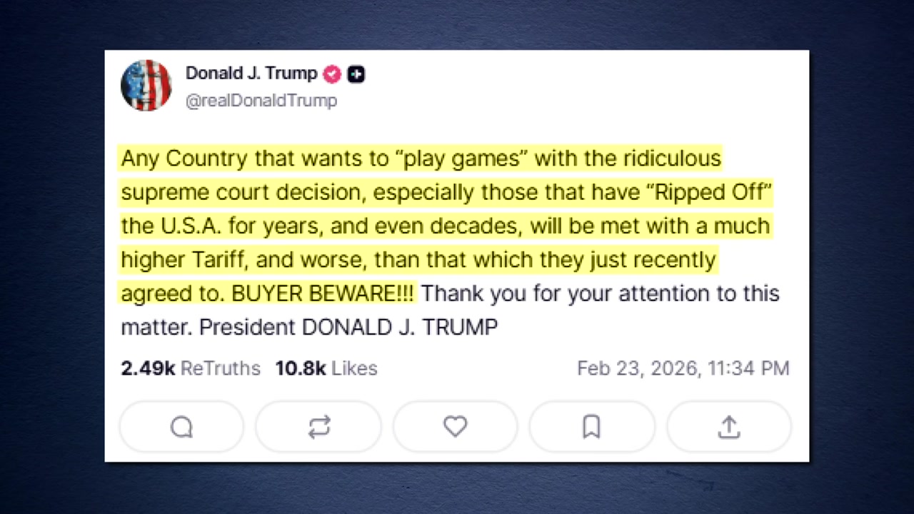 트럼프 대통령은 현지 시간 23일 소셜미디어에서 "어떤 나라든 대법원의 터무니없는 결정으로 장난을 치려 한다면, 특히 미국을 '뜯어 먹어온' 곳은, 그들이 최근 동의했던 것보다 더 높은 관세와 더 나쁜 것을 마주하게 될 것"이라고 밝혔습니다.