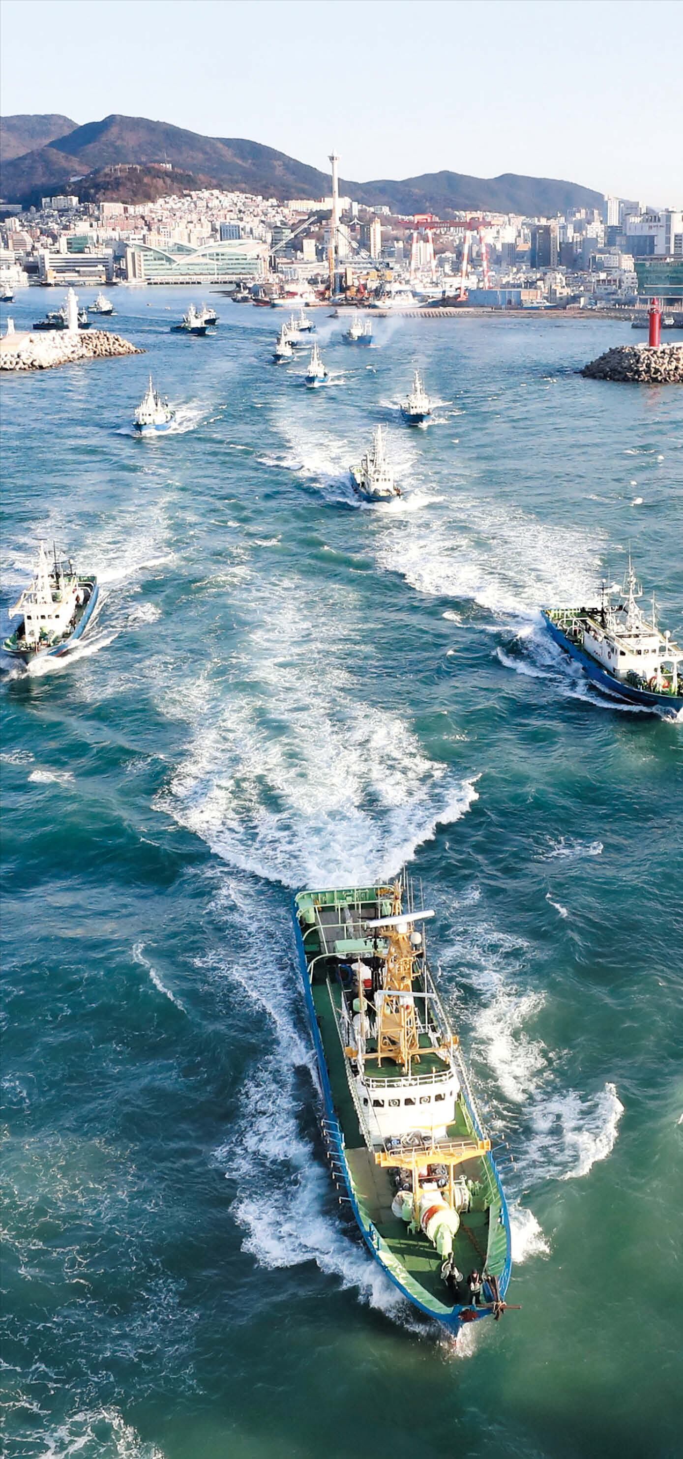 23일 오전 고등어잡이 어선들이 부산 서구 부산공동어시장 부두를 출발하고 있다. 이날 대형선망수협 소속 어선 100여 척이 조업을 위해 남해로 나갔다. 고등어는 어선 6척이 하나의 선단을 이뤄 잡는다. 고등어 떼를 그물로 포위한 뒤 끌어올린다. 대형선망수협은 국내산 고등어 어획량의 80% 이상을 차지한다.