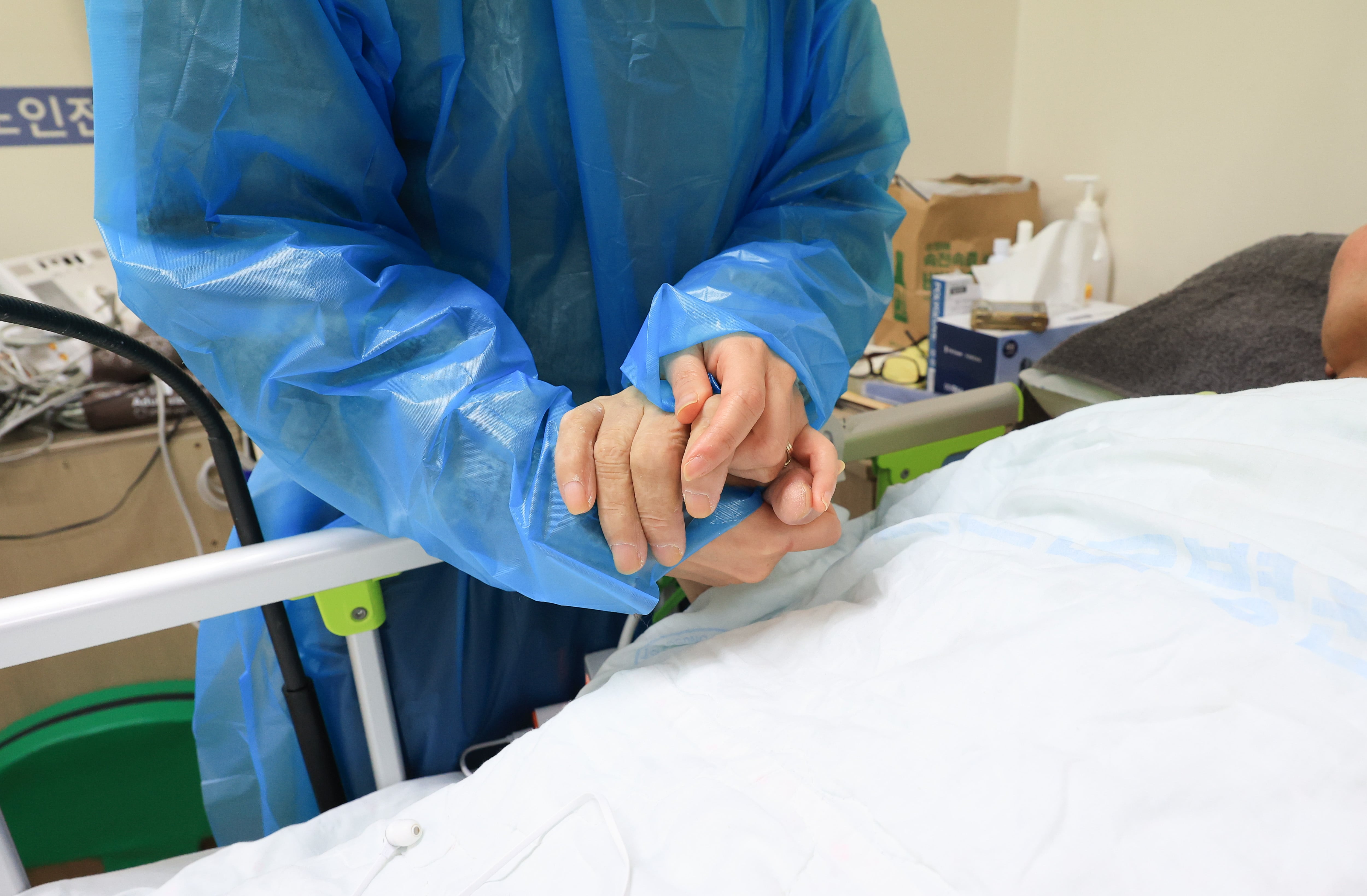 지난 10일 경기도 한 요양병원에서 간병을 하던 한 환자의 가족이 손을 꼭 잡고 있다. / 고운호 기자 |