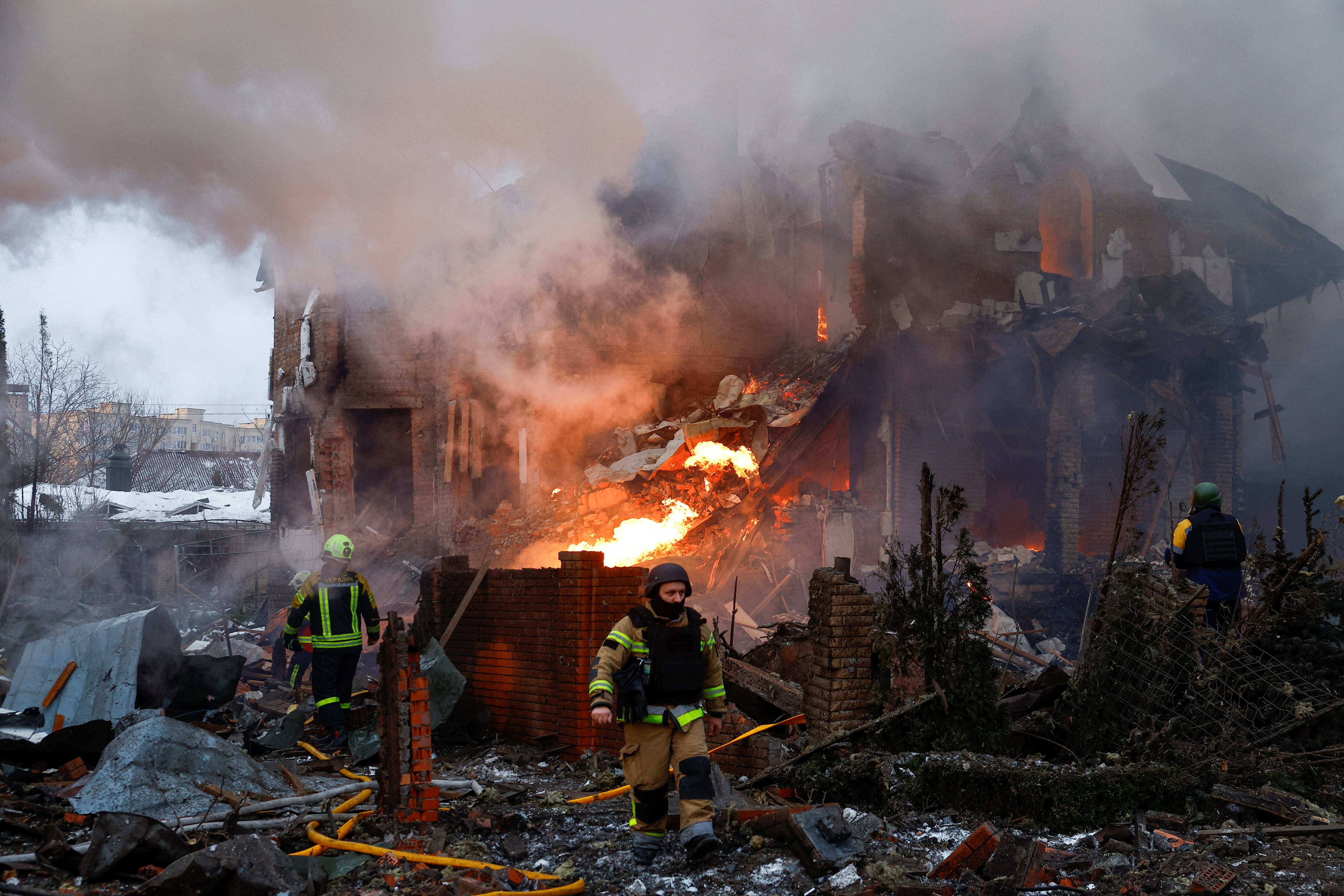 22일 러시아의 드론과 미사일 공격을 받은 우크라이나 키이우의 건물이 불타 소방대원들이 진압에 나서고 있다. /로이터 연합뉴스 |