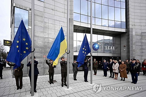 우크라이나전 발발 4주년을 하루 앞둔 23일(현지시간) 유럽연합 대외관계청(EEAS) 건물 앞에 우크라아나와 유럽연합기가 게양되고 있다. [AFP 연합뉴스 자료사진. 재판매 및 DB 금지] |