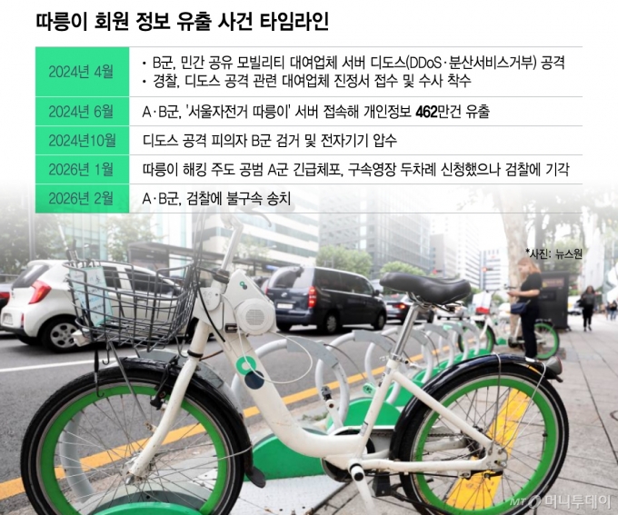 경찰에 따르면 피의자들은 2024년 6월28~29일 서울시설공단이 운영하는 따릉이 서버에 침입해 가입자의 아이디와 휴대전화번호 등 개인정보 약 462만건을 유출한 혐의를 받는다.