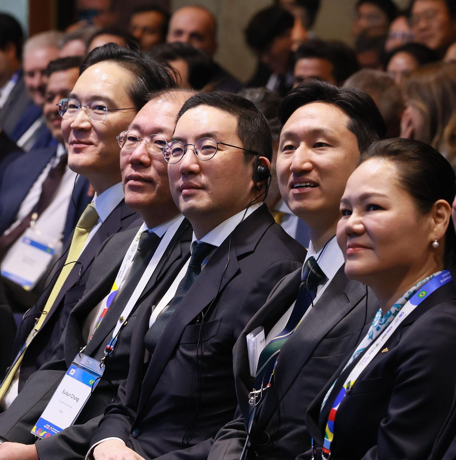 23일 서울 중구 롯데호텔에서 열린 ‘한-브라질 비즈니스 포럼’에 주요 기업 총수들이 참석했다. 앞줄 왼쪽부터 이재용 삼성전자 회장, 정의선 현대자동차그룹 회장, 구광모 LG그룹 회장, 정기선 HD현대 회장. 최태원 SK그룹 회장은 이날 열린 국빈 만찬에 합류했다. 한국경제인협회 제공 |