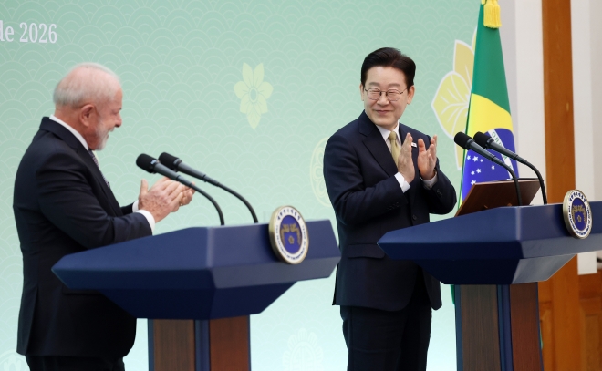 이재명 대통령과 루이스 이나시우 룰라 다시우바 브라질 대통령이 23일 청와대에서 한-브라질 공동언론발표를 마친 뒤 박수치고 있다. 2026.2.23. 연합뉴스 |