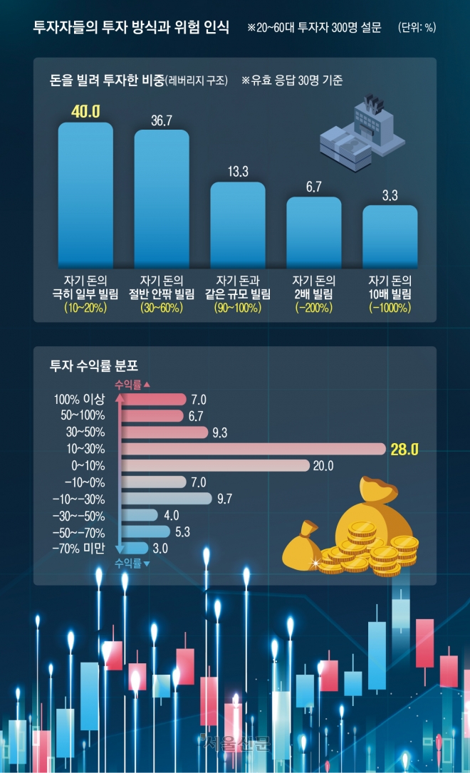 전체 응답자 300명 중 30명(10.0%)은 돈을 빌려 투자했다고 답했다. 이들 중 자기 돈과 비슷한 수준(90~100%)을 빌린 사람은 4명(13.3%)이었다. 여기에 자기 돈의 두 배 이상(200~1000%)을 빌린 3명(10.0%)까지 합하면, 총 7명(23.3%)은 자기자본과 맞먹거나 그 이상을 빌린 셈이다. 주가가 오르면 수익이 빠르게 늘지만, 떨어지면 손실도 못지않게 커질 수밖에 없다. 개인 투자자가 감당해야 할 위험이 그만큼 커졌다는 의미다.