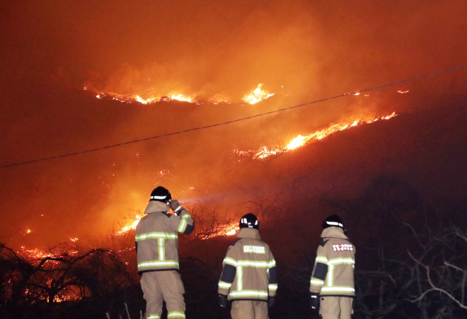 경남 밀양 산불, 강풍 타고 확산… 야간진화 전력 - 경남 밀양시 삼랑진읍 검세리의 야산(해발 250m)에서 23일 오후 4시 10분쯤 발생한 산불이 강풍을 타고 확산하고 있다. 이 산불로 국가소방동원령이 내려졌고, 소방·산림당국은 야간 진화에 나섰으며, 인근 주민들이 대피했다. 경남 함양군에서 지난 21일 발생한 산불은 44시간만에 주불이 잡히는 등 건조한 날씨 속에 바람까지 강하게 불면서 전국 곳곳에서 산불과 화재가 잇따르고 있다. 밀양 뉴스1 |